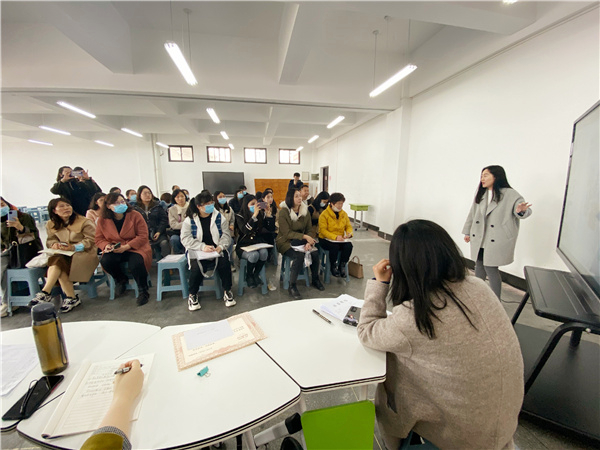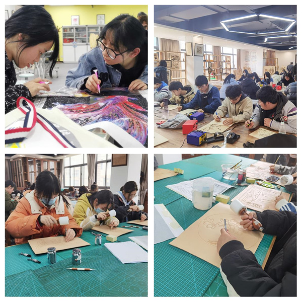 活动中,各个中职学校的美术老师们进行了专业综合教研,学校设立了非遗实训室,有版画、面人泥塑、陶艺、皮雕、烙画等等,大家围绕作品展开热烈的研讨。研讨过程中,大家畅所欲言,结合自己的教学实践,或分享自己在教学中的收获,或提出教学中的困惑,实训室内洋溢着浓郁的教研氛围。