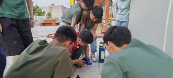 学生们不畏炎热,认真的听师傅讲解、示范,杨帆老师也深入到学生当中去,跟学生们一起学习。过程中,师傅给学生们详细讲解了如何做好铺贴排砖计划、如何泡水和清理墙面,还有勾缝问题的处理等专业技巧。