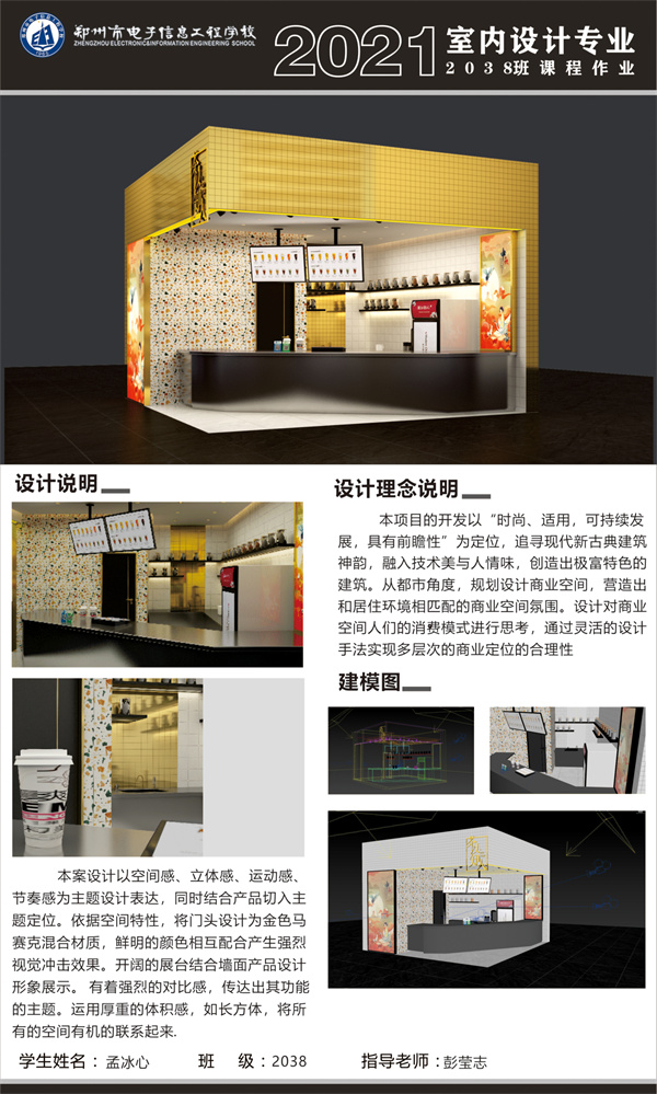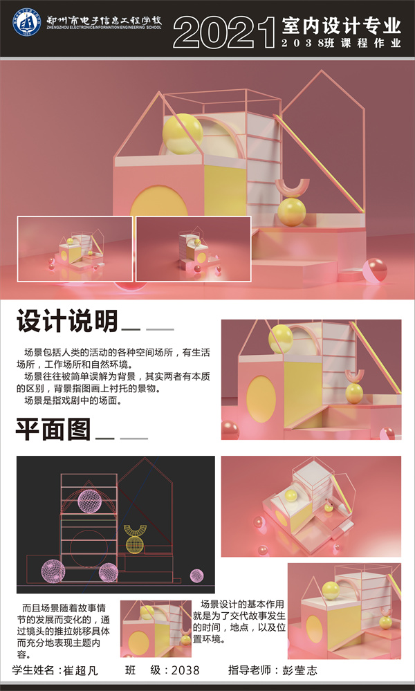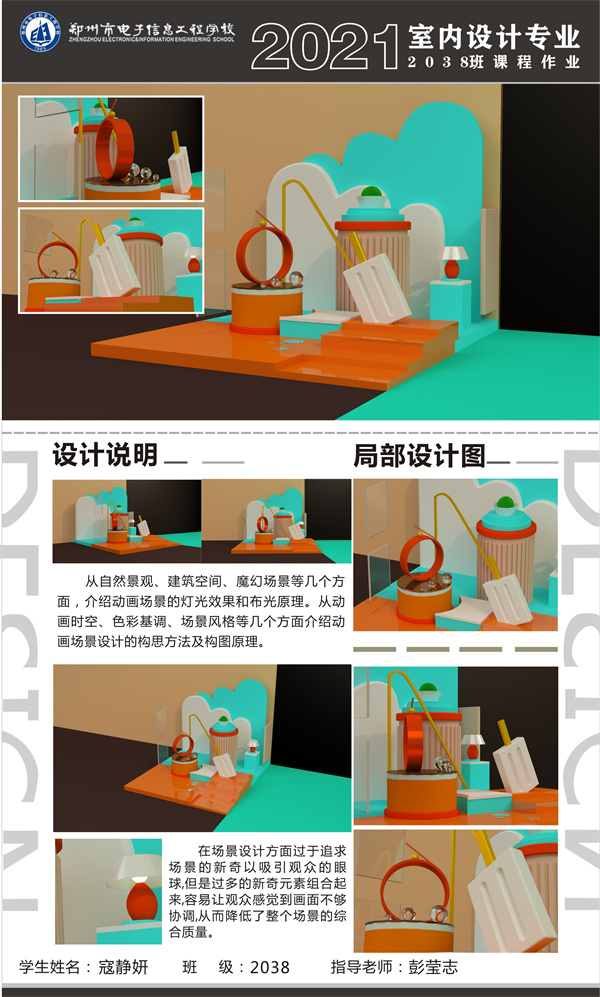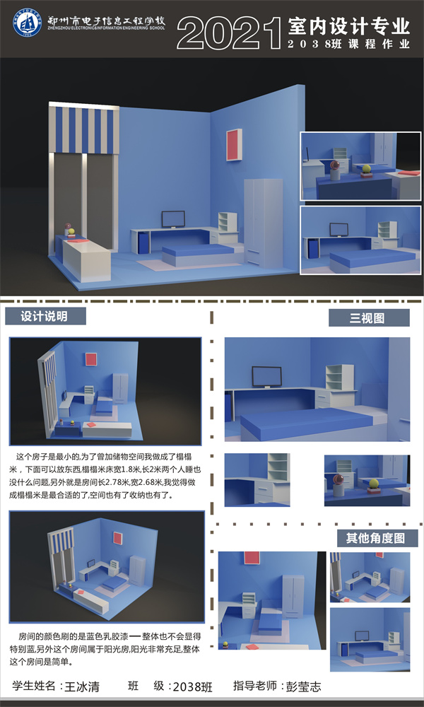 《三维设计基础》课程是室内设计专业的一门主干必修课程,通过学习,可以让学生了解现代室内设计的三维效果图表现方法及软件操作技术,掌握室内空间合理的设计定位和操作应用,为同学们今后能够完整的掌握室内设计、服务于社会打下坚实基础。课程中学生们克服了课下没有电脑的困难,平时练习在课堂完成,充分利用各种工具,采用各种形式完成作业,艺术设计系建筑装饰技术专业(室内设计方向)学生在本次课程中创作出了大量优秀的结课作品,充分体现了本次课程设计的开展成效,以及丰富的收获。