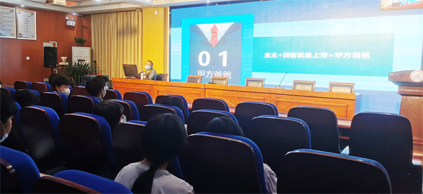 讲座采用线上线下两种模式,以《甲方爸爸》的标题吸引了师生的注意力。人在江湖漂,怎能不遇到几个甲方爸爸?听到王老师的开场你就应该明白了,讲座内容以学生毕业工作后面临工作中的甲方为主线。王老师拿出真实案例: