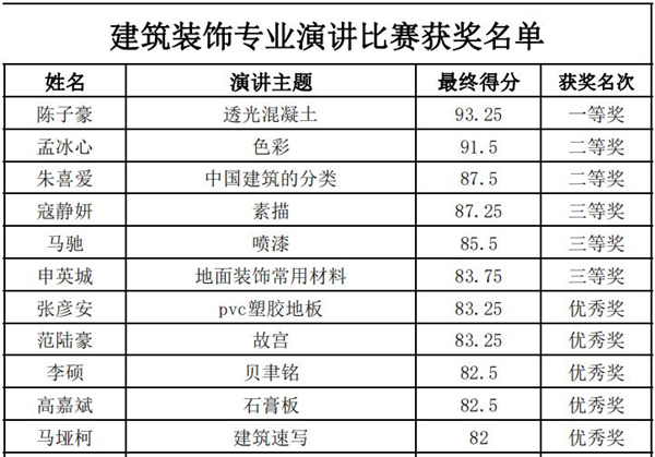 活动开始主持人彭莹志老师对参加活动的评委老师及比赛流程进行介绍,并以抽签的方式进行公平公正的演讲排序。比赛中各位参赛学生紧紧围绕建筑装饰类专业知识,从自己平时专业学习中所关注到的独有角度出发,用了近两周的时间进行装备。他们从专业知识点的选取、资料收集与素材整理、PPT制作,到利用课余时间进行自学和练习。最后把自己的收获通过讲演的方式传递给更多的同学。