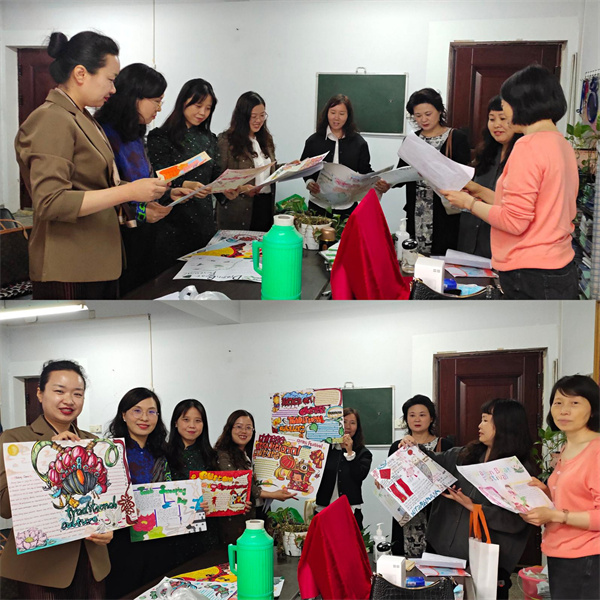 (英语教研组老师对手抄报制作大赛的作品进行评比)