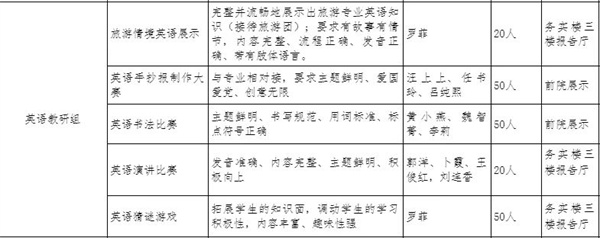 英语教研组为了全面提高学生的英语素养,激发学生的英语学习兴趣,鼓励更多的学生参与到活动中来,在科技文化艺术节期间举办了专题讲座、知识竞答,并设置了五项精彩纷呈的英语活动。这些活动与学生的专业相对接,让学生发挥了专业特长。以活动促进专业,用专业引导学生,寓专业知识于活动中,不仅发挥其教育功能,激发学生的学习热情,而且提高了学生的专业素养。