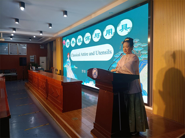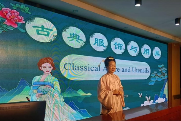 “哇哦,好漂亮!汉服!”4月13日晚,郑州市电子信息工程学校务实楼三楼报告厅传来称赞声,原来是英语组罗菲老师身着端庄、典雅的明制汉服给同学们做有关古典服饰与用具(Classical Attire and Utensils)的专题英语讲座。罗菲老师表示,之所以身着汉服,一是服饰贴近讲座的主题,二是想用一种新颖的方式吸引学生的注意力;想通过这种表达方式让学生形象地、直观地了解中国古典服饰。