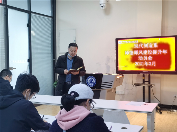 为响应学校要求学习《郑州市教育系统“师德师风建设提升年动员会”实施方案》(以下简称《实施方案》)的通知,3月22日,现代制造系召开师德师风建设提升年动员会。