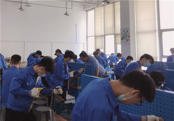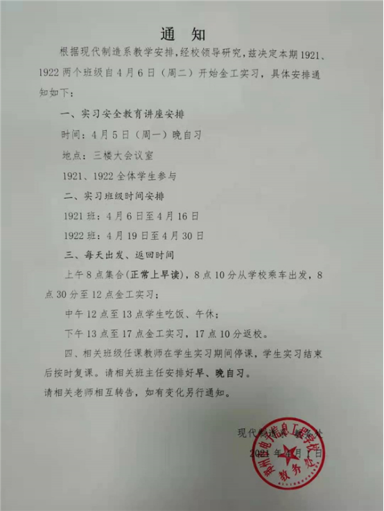 4月6日清晨,此次金工实习正式开始。为配合疫情防控、确保实习工位与实习人数合理配置,现代制造系专业课教师团队为实习班级学生做了精心时间安排。两个班级轮训,每班为期十天;每日早读之后,实习班级学生于8:10从学校乘车出发,大约20分钟的车程后到达实习工厂;每天8:30-12:00和13:00-17:00为金工实习时间,午间一小时为吃饭、午休时间,17:10乘车返回学校,正常参与晚自习。