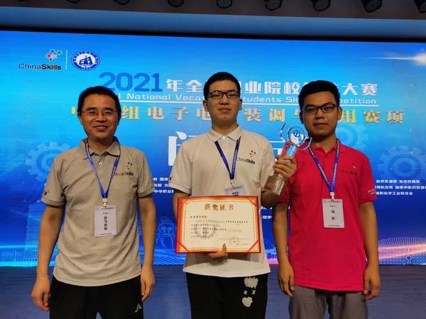 李良老师(左)、2021年国赛一等奖选手高海斌(中)、苑锋老师(右)