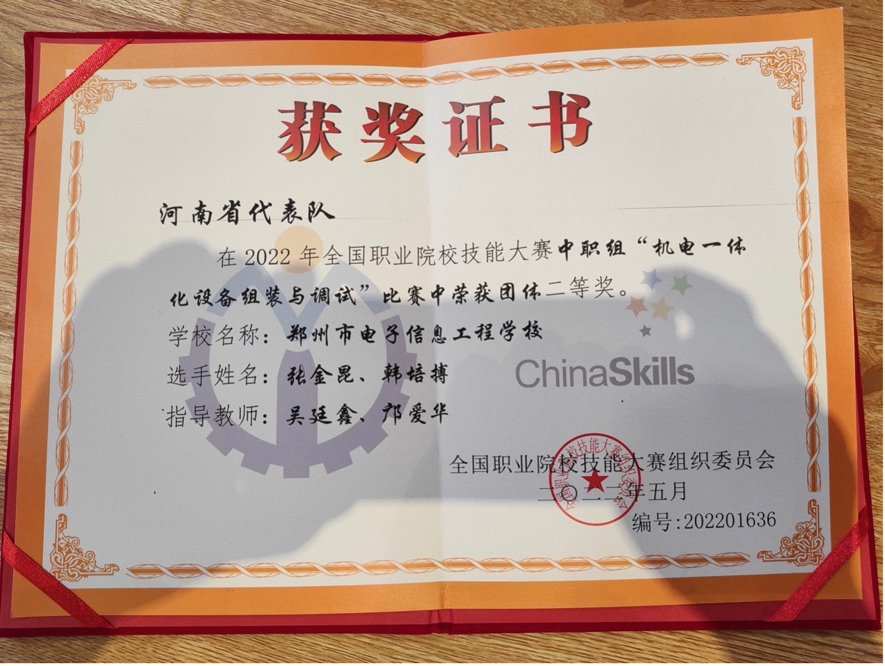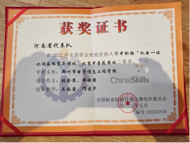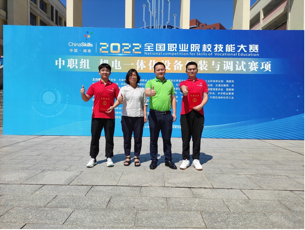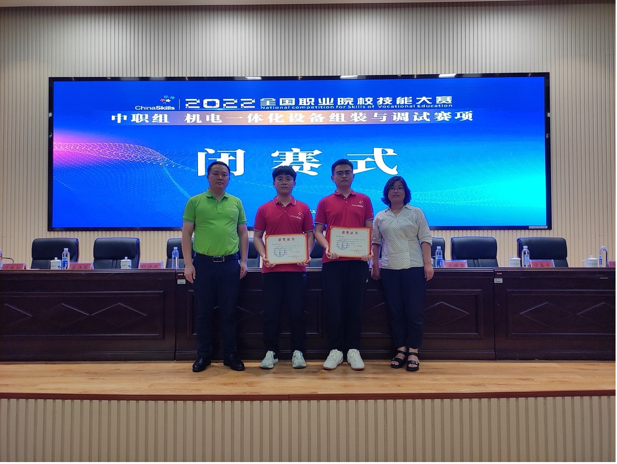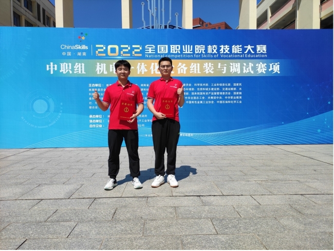 2022年8月16-17日,全国职业院校技能大赛机电一体化设备组装与调试赛项中职组在湖南长沙市举行。在吴廷鑫、邝爱华两位老师的指导下,现代制造系工业机器人技术应用专业的张金昆同学和机电技术应用专业的韩培搏同学沉着应战,稳定发挥,获得二等奖。