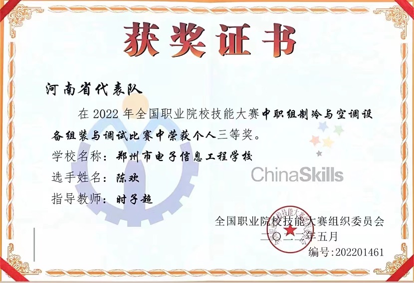 2022年8月19日,全国职业院校技能大赛中职组制冷与空调设备组装与调试赛项在无锡机电高等职业技术学校落下帷幕,时子超老师带领现代制造系供热通风与空调施工运行专业的陈欢同学取得了全国三等奖的好成绩。