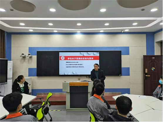 接着,实训室主任刘奇超做出关于竞赛的安排与要求。他指出,距离国赛时间紧迫,辅导教师应加强实训室管理,选手应迅速进入训练状态。并针对于往年没有参加国赛的项目,他要求项目人员应多钻研往年国赛试题,关注题型和技能的变化。