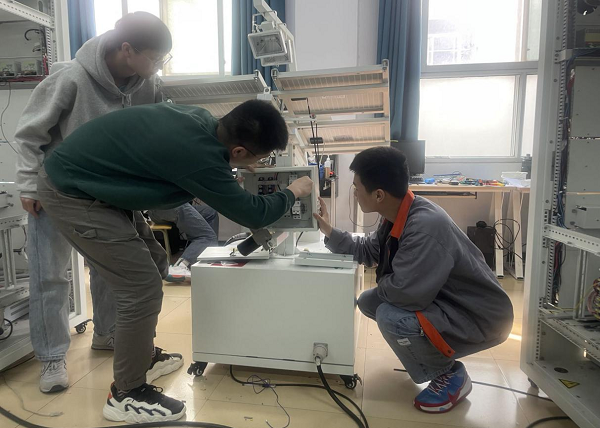 黄硕老师正在和学生一起安装光伏防雷直流汇流箱