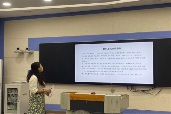 信息技术系主任李喜英宣读了选举要求,选举对象为学校在编人员,选举要兼顾到男女、年龄、专业等各种情况。除此之外还要遵循以下原则。一、拥护党的改革开放政策,坚持四项基本原则,热爱党,热爱社会主义,热爱本校。二、努力学习政治、科学、文化知识,不断提高思想政治觉悟、教学业务水平和参加管理的能力。三、积极参与本校改革和各项民主管理活动,能正确处理国家、集体和个人三者关系。四、实事求是,坚持原则,力事公道,能密切联系群众,代表职工的合法利益,如实反映教职工的意见和要求,认真执行教职工代表大会的决议,做好教职工代表大会交给的各项工作,能积极向教职工宣传和落实教代会的决议和大会精神。五、模范遵守国家的法律、法规和学校规章制度,以主人翁的态度努力做好本职工作。