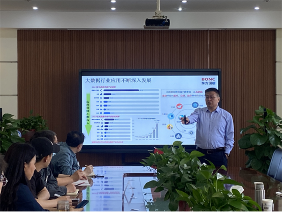 接下来是交流的主体。李总向我们展示了渊博的常识、学者的风范,紧扣李主任提出的问题为我们进行了长达近两个小时的讲解。李总先是结合东方国信的实际项目给我们讲解了大数据的特征、大数据驱动人工智能的发展及云计算、大数据在众多行业的应用场景等,其间还多次与我校教师交流互动、释疑解惑、加入指导;其次李总还基于企业和市场的需求,为我校大数据技术专业的发展方向给出了建议,强调像数据采集、数据标注、数据可视化等都是中职生可较好掌握切人才需求多的方向,并对专业课程的规划提出了建议。最后,李总还就大数据专业的教师培养、学习规划给予了指导,并诚挚邀请我校青年到东方国信参予大家项目的学习,切实通过真项目学到实用的大数据技术,为教学工作积聚力量。