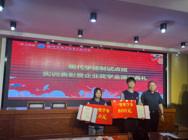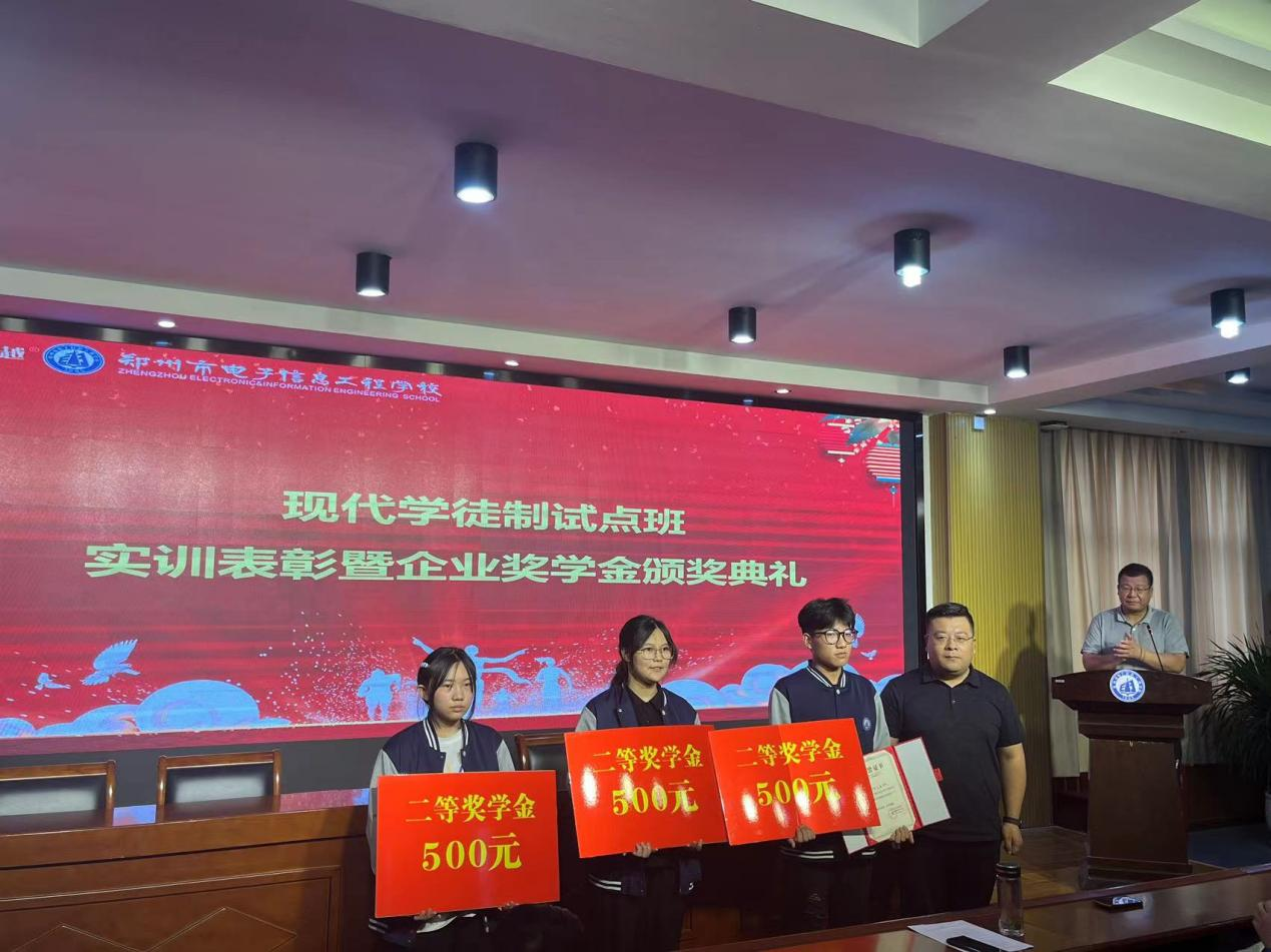 2023年6月2日,郑州市电子信息工程学校信息技术系隆重举行了第四期现代学徒制实训成果暨奖学金表彰活动,对实训周中表现优异的同学进行了嘉奖,并为21级同学表现优异的同学颁发了企业奖学金。本次活动由学校教务处主任席明闰主持,学校党委书记校长李京辉、副校长李向伟、信息技术系主任李喜英及郑州京慧越科技有限公司总经理王东、副总经理杨倩等领导出席了本次活动。