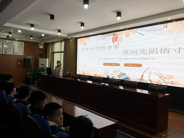 10月10日上午,会计信息工作室骨干教师杨静冉老师,在学校大会议室给新生们介绍本专业的相关情况。