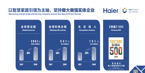 海尔集团始终以用户体验为中心,踏准时代的节拍,从资不抵债、濒临倒闭的集体小厂发展成为引领物联网时代的生态系统,成为BrandZ全球百强品牌中第一个且唯一一个物联网生态品牌。2018年,海尔集团全球营业额达2661亿元,同比增长10%;全球利税总额突破331亿元,同比增长10%;生态收入达151亿元,同比增长75%。海尔已成功孵化上市公司4家,独角兽企业2家,准独角兽及瞪羚企业12家,在全球设立10大研发中心、25个工业园、122个制造中心,拥有海尔、卡萨帝、统帅、美国GE Appliances、新西兰Fisher&Paykel、日本AQUA、意大利Candy等智能家电品牌;日日顺、盈康一生、卡奥斯COSMOPlat等服务品牌;海尔兄弟等文化创意品牌。