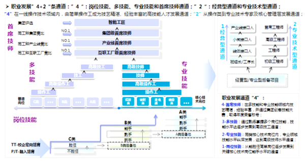 在工业4.0时代,员工也要从传统的操作者转变成能够管理智能设备、改善并优化智能线体效率的知识型员工;海尔为一线知识型员工搭建了首席技师型职业发展通道,“首席技师” 象征着某类工种技术水平的佼佼者,是此类工种的最权威人士。首席技师发展通道分为新手、熟手、能手、高级技工、技师、高级技师、互联工厂级首席技师、产业线级首席技师以及集团级首席技师。