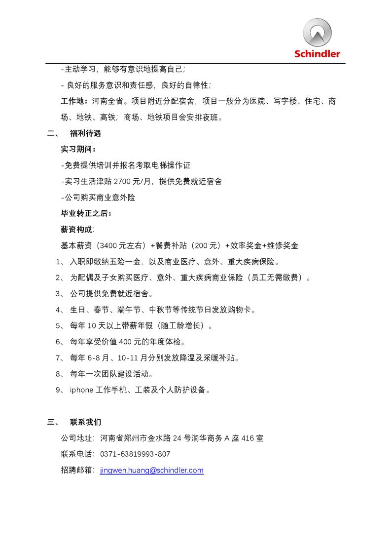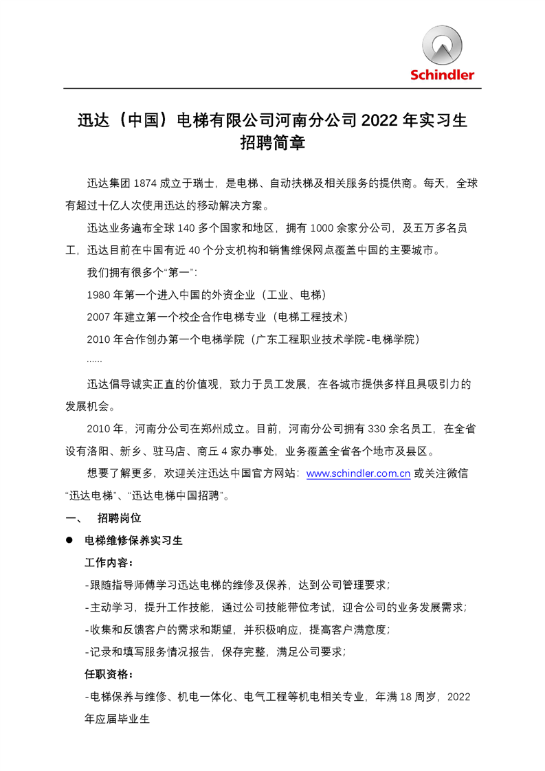 迅达(中国)电梯有限公司河南分公司招聘简介