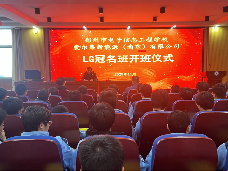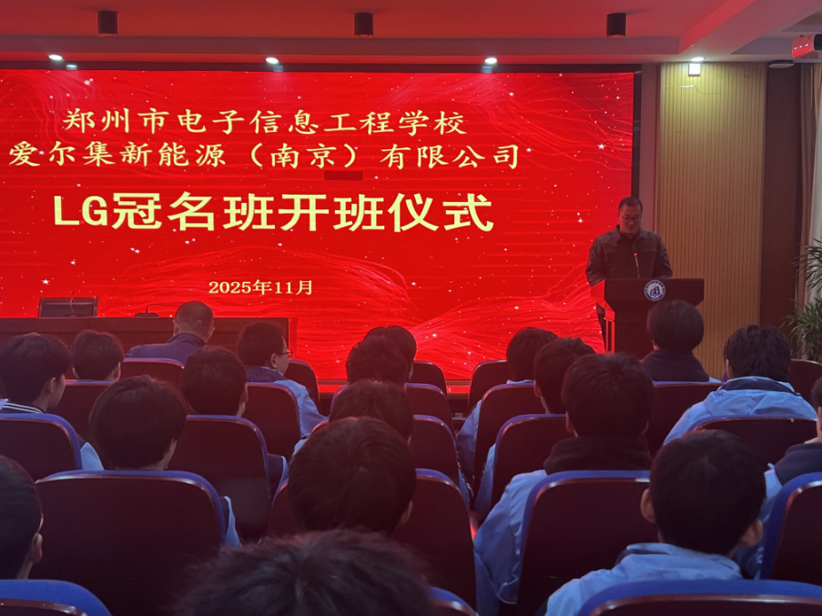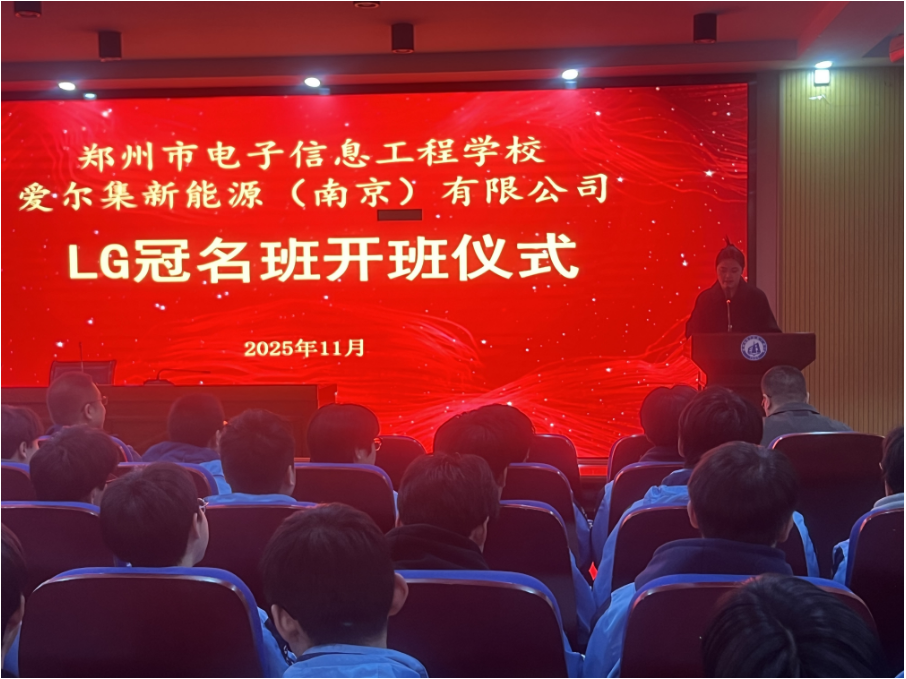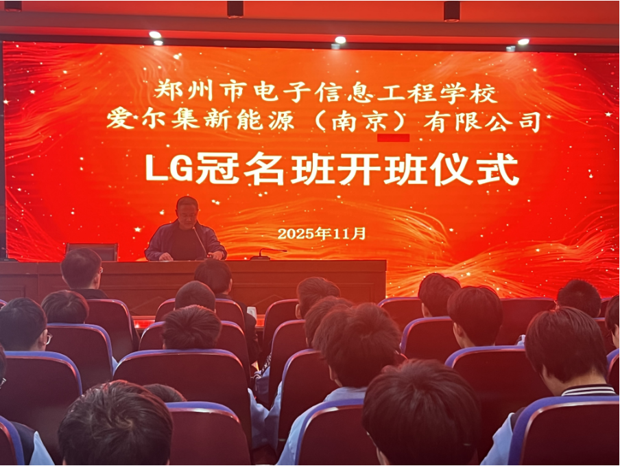 2025 年 11 月 21 日上午,郑州市电子信息工程学校隆重举行爱尔集新能源(南京)有限公司冠名班授牌仪式暨授课活动。爱尔集新能源(南京)有限公司人才确保部部长辛玉国、人才育成部部长徐继曾、人才育成部高级主管张琬迎,我校副校长高勤华、招生就业办主任尹春鹏,以及 2526 班班主任郝梦月、2527 班班主任牛心语出席活动,仪式由尹春鹏主任主持。